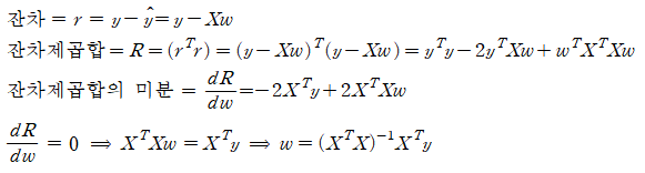 선형 회귀 관련 글을 읽다 OLS formula- 라는 것을 접했는데, 보통의 최소제곱..? 이라고 해석되는 OLS는, 결국 저희에게 친숙한 최소제곱법(Least square method)을 통한 풀이방식 중 하나인 것 같습니다. y = ax +b 라는 식으로 시작되어 문제를 해결하는 선형 회귀 모델은 실제 행렬을 통해 포현하면, Homogeneous coordinate를 통해, y = Xw와 같은 식으로 표현될테고, 이들의 잔차(Residual)는 y - y^ = y - Xw 로 표현되겠지요. 그럼 이런 잔차들의 제곱합 = Sum(y-Wx)^2을 최소화하는게 저희의 문제, 즉 최소제곱법 문제입니다. 이러한 문제는 경사하강법 또는 뉴턴법 등의 다양한 알고리즘으로 풀 수 있을텐데, 이중 가장 Ordinary한 풀이 방법이라 하여 OLS라 칭하는 것 같습니다. 내용의 골자는, 그냥 잔차 제곱합의 미분식이 0이 되도록 하는 W를 직접 계산하라는 겁니다. 아래와 같이 진행하면됩니다.