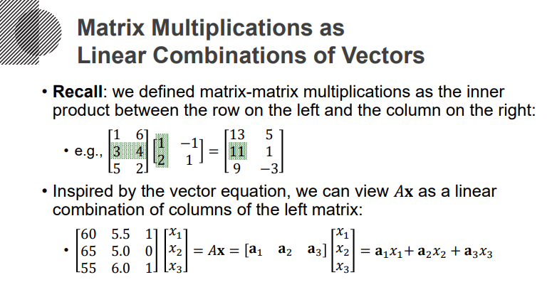 이번에는 다시, 행렬의 곱연산을 이해하는 4가지 시각에 대해 알아보겠습니다. 이 또한 굉장히 중요한데요. 저희가 행렬간 연산을 진행한다는 말은, 두 개 벡터간의 행렬 연산을 따로따로 진행하는 셈입니다. 그런데 이게 굉장히 번거롭죠. 행렬의 쌍마다 따로 따로 계산을 하면, 두 개 행렬의 사이즈가 커질수록, 복잡도가 굉장히 늘어날테니까요. 그래서, 이걸 한 번에 계산되게할 방법이 없을까-에 대해 생각해봅시다. 벡터 방정식이 그 Key가 될 겁니다.