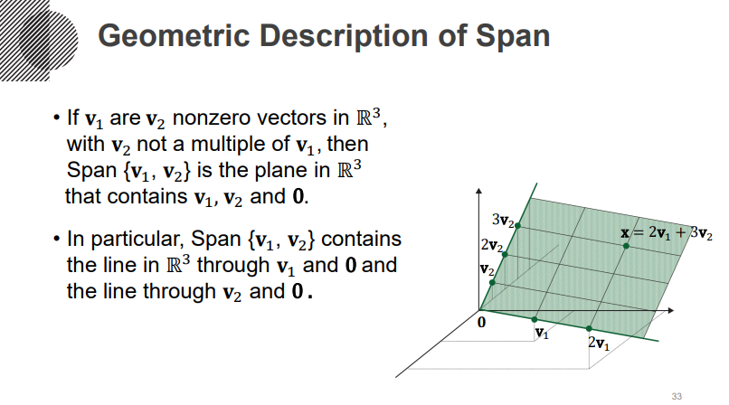 그러면, 이러한 Span은 기하학적으로, 공간적으로 어떤 의미를 갖는 지 생각해봅시다. 아래 그림을 보면 v1과 v2라는 2개의 벡터를 선형 결합하면, 하나의 평면(Plane)을 생성할 수 있게되죠. 이런 생각을 확장한다면 3개의 독립 벡터로는 하나의 Cubic같은 공간(사실상 3차원 공간 전체)을 생성할 수 있습니다.