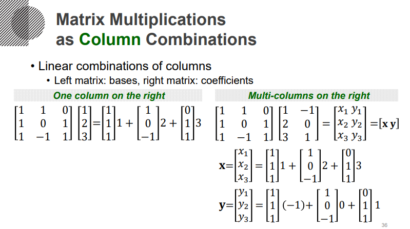 기본적인 행렬 곱연산을 생각해보면, 이들은 아래와 같이, 결국 선형결합으로 표현할 수 있겠죠. 보시면 x,y는 같은 벡터에 계수만 변화시켜 구성됩니다.
