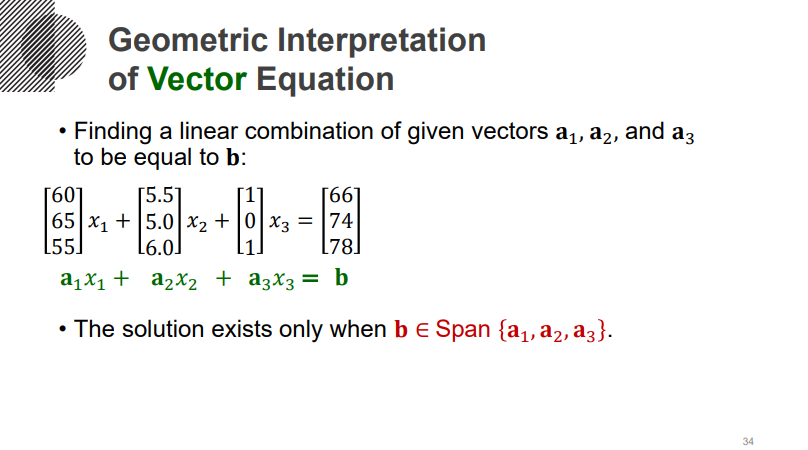 이러한 개념으로 벡터 방정식을 다시 들여다봅시다. 전체 공간이 3차원인데, 내가 가진 벡터는 2차원이라면, 이런 벡터를 아무리 선형결합한다한들, 3차원 공간 전체에 매핑될 수는 없어요. 이 말이 무슨말인가하면, 정확한 해를 구하지 못할 수 있다는 말입니다. 어떤 벡터들을 선형결합해서 만든, Span된 그 공간 안에, b라는 값이 존재해야 Solution이 존재할텐데, 내가 Span할 수 있는 공간은 전체 차원에 비해서 굉장히 조그마하니, b가 그 공간안에 있을 확률은 굉장히 적어지는거죠. 그러니까, 주어진 벡터로 Span된 공간 안에 b가 속할 때, Solution은 존재하는 겁니다.