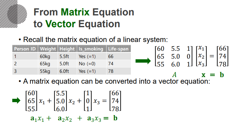 앞서서, 선형시스템을 살펴봤었는데요. 아래 그림에서 Ax = b처럼, 행렬을 통해서 표현했었죠. 이번에는 선형결합을 사용해서 표현할테니, a1x1 + a2x2 + a3x3 = b 라는 방식으로, 벡터를 통해 표현될겁니다. 그리고 이런 형태를 벡터 방정식이라고 합니다. 이런 벡터 방정식으로 통해서 저희는, 공간적인 개념을 획득할 수 있게 되는데요.