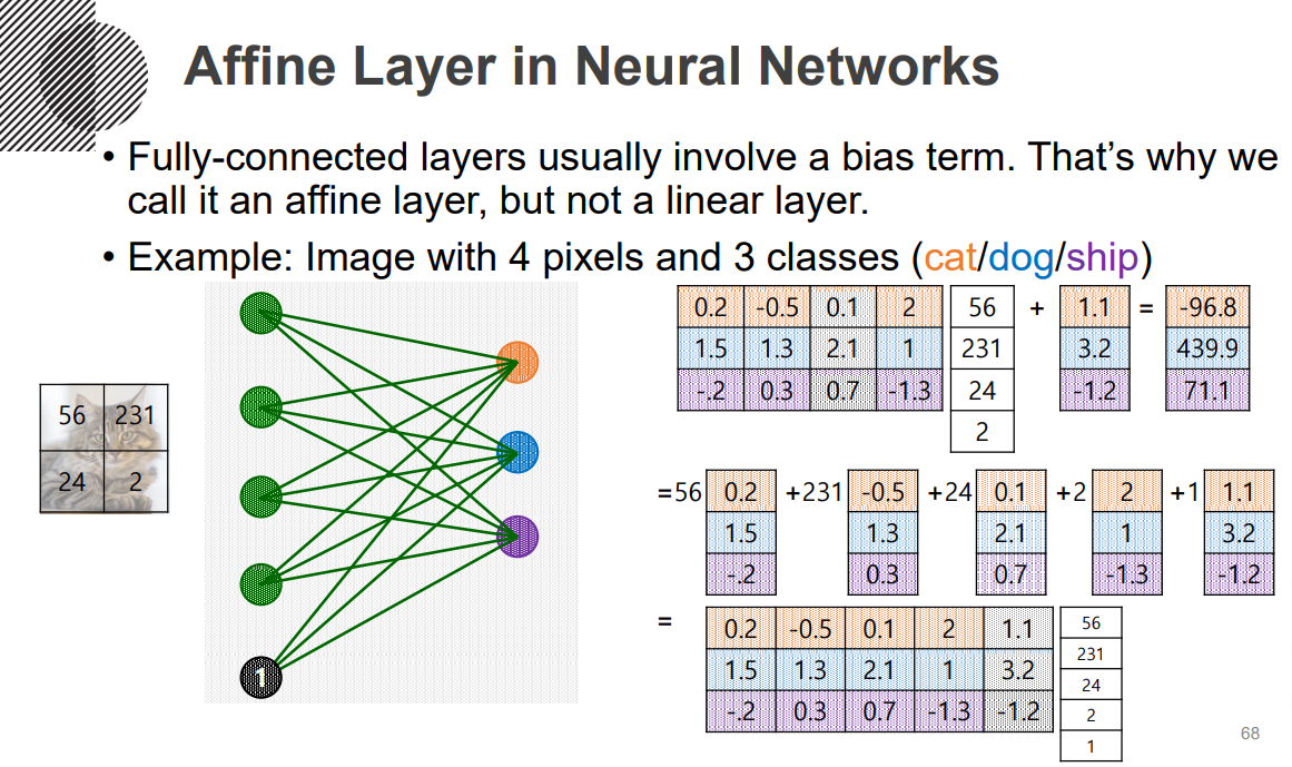 그리고 Affine layer에 대해 설명을 드리자면, Affine transform이라는 건, 전에 설명드렸던 y=3x+2와 같이, 선형변환에 Bias가 추가된 변환입니다. 이런 Affine transformation은 그 자체로는 Linear하지 않지만, 굉장히 쉽게 Linear하게 바꿀 수 있습니다. 실제로 아래 그림과 같이 Fully-connected layer는 Bias term을 갖게끔 구성되며, 때문에 Linear layer가 아닌 Affine layer라고 칭합니다. 아래 그림을 보면, 입력으로 사용되는 Feature vectors의 가장 밑에 1을 추가하여 Linear한 성질을 갖도록하며, Standard matrix에 해당하는 Coefficients와 Bias term이, 우리가 NN를 통해 예측하고자하는 변수가 되는 거죠.